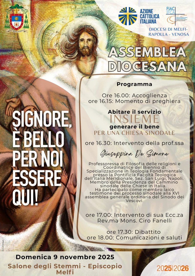 Si terrà domenica 9 novembre alle ore 16.00 presso il Salone degli Stemmi dell’Episcopio di Melfi l’Assemblea Diocesana di tutti i membri dell’Azione Cattolica della nostra Diocesi.