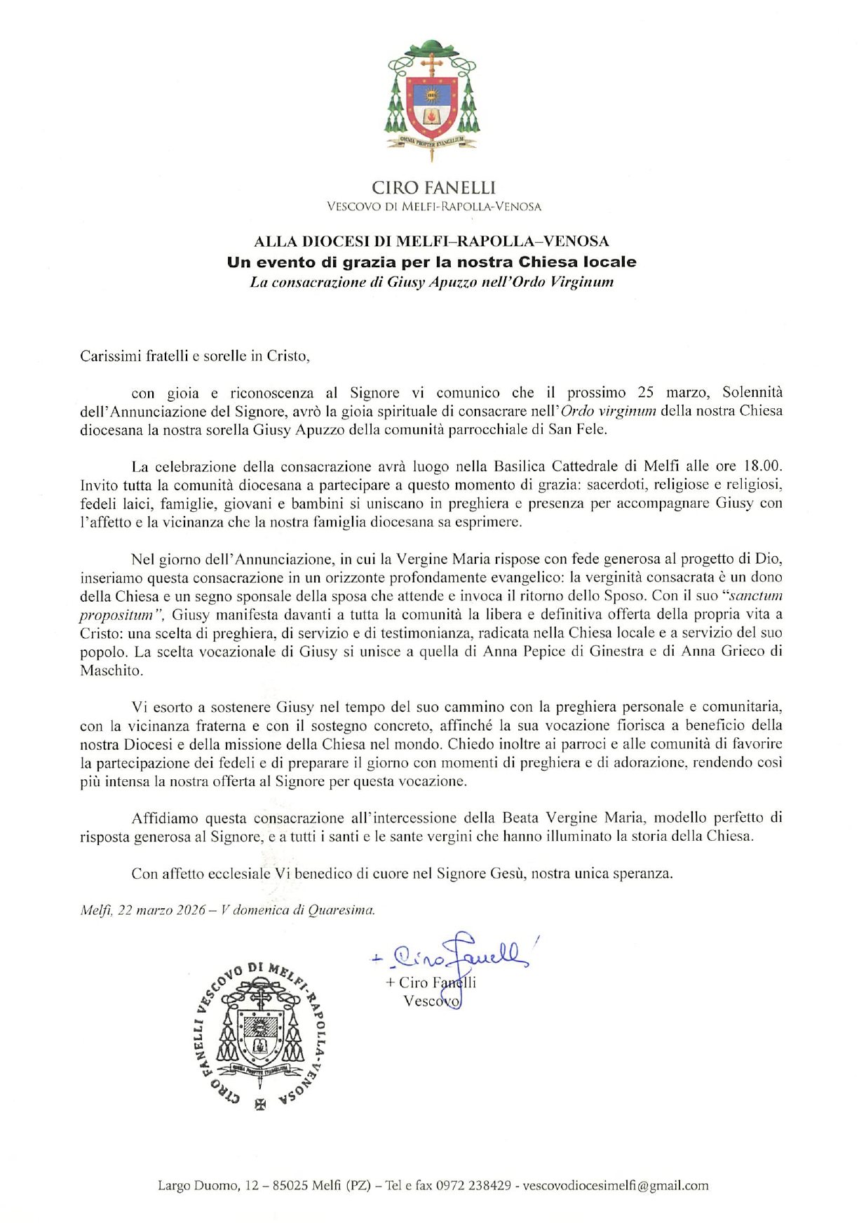PEC ufficiale della Diocesi: diocesi.melfi_rapolla_venosa@legalmail.it