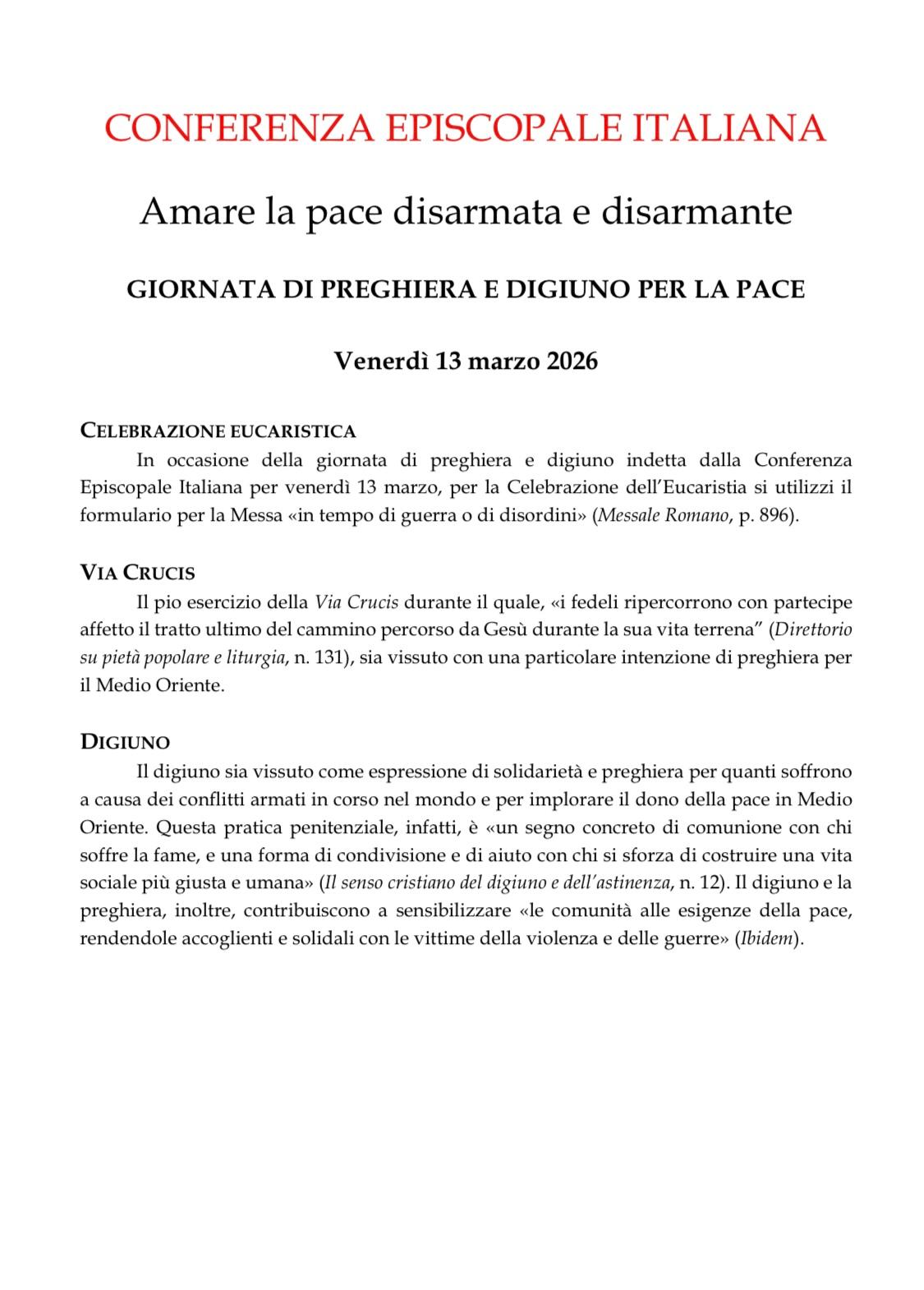 violenza prima che diventi una voragine irreparabile», ha promosso una Giornata di preghiera e digiuno per il prossimo venerdì 13 marzo 2026.