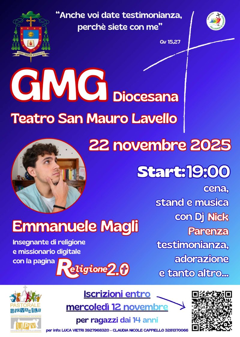 La nostra Diocesi si prepara a vivere un momento di intensa spiritualità e gioiosa comunione in occasione della Giornata Mondiale della Gioventù (GMG) diocesana, in programma sabato 22 novembre a Lavello, presso il Teatro San Mauro.