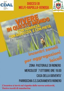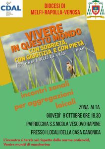 Nell’ambito  dell’anno dedicato all’Enciclica di Papa Francesco Laudato  si’, a cinque anni dalla sua promulgazione,  la presidenza della Consulta diocesana delle Aggregazioni laicali, dopo il convegno sull’enciclica  stessa, che ha visto la partecipazione di Simona Loperte ingegnere ambientalista, Direttore dell’Ufficio Pastorale  Sociale e del Lavoro della Diocesi di Potenza e già  Segretaria nazionale  del MLAC e dopo la conseguente  costituzione di un gruppo di studio “Laudato sii” per la salvaguardia  del creato, promuove per le diverse aggregazioni  laicali presenti in diocesi,  degli incontri zonali  sugli Stili di vita.